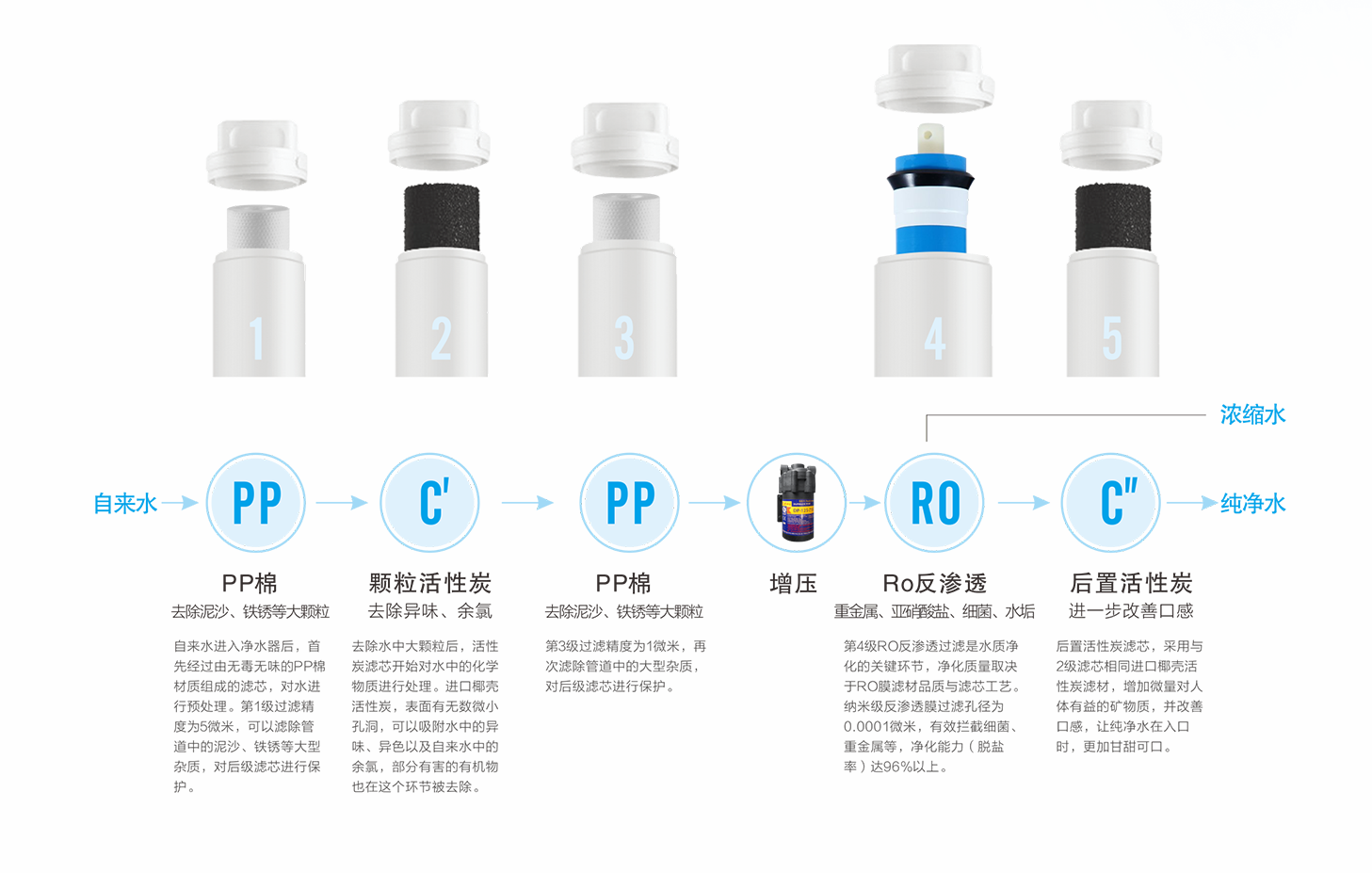 威可利直飲水設(shè)備采用五級(jí)高效過(guò)濾,分別是PP棉+顆粒活性炭+精密PP棉+RO反滲透+后置活性炭。PP棉+顆?;钚蕴?精密PP棉可以對(duì)自來(lái)水進(jìn)行粗過(guò)濾,攔截泥沙、鐵銹等小顆粒雜質(zhì),吸附水中異色、異味和余氯,并且對(duì)后級(jí)濾芯進(jìn)行保護(hù);RO反滲透過(guò)濾精度為0.0001微米,有效攔截細(xì)菌、重金屬、有機(jī)物等;最后一級(jí)后置活性炭則是為了增加微量對(duì)人體有益的礦物質(zhì),并改善口感。